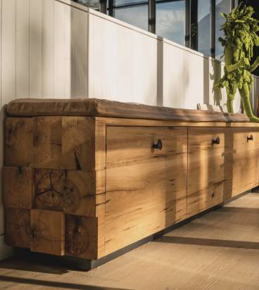 A deep attraction for custom integration achieving, balancing rustic decor with refined elements.